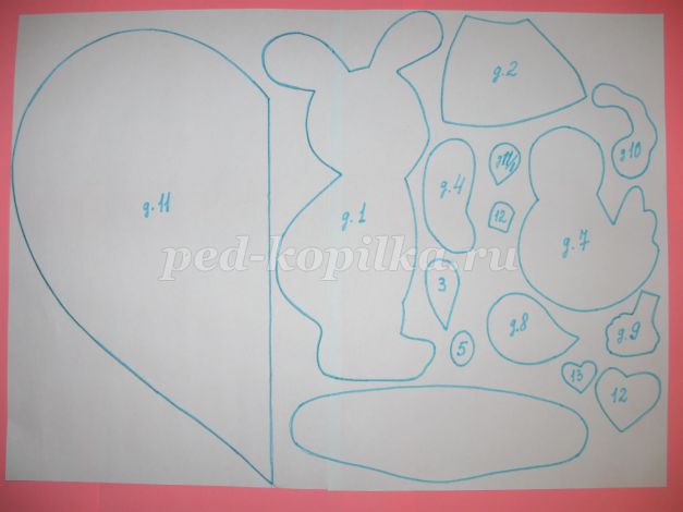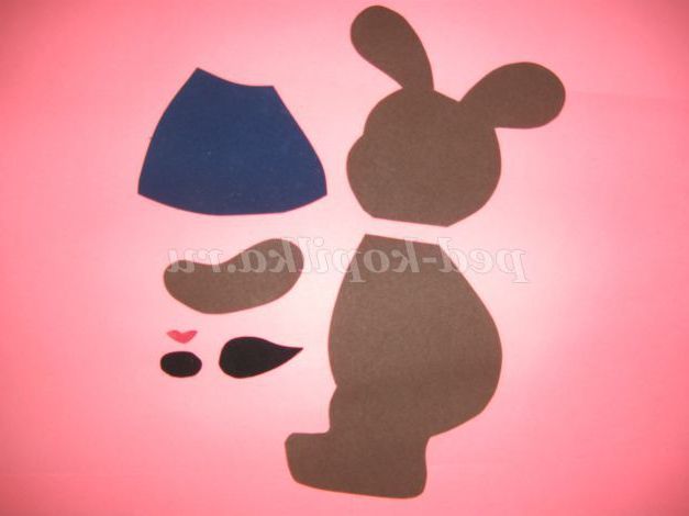 Викроюємо тулуб зайчика(коричневе)-1 де, сорочка(синя)-2 дет, лапка(коричнева) - 4 дит, носик(чорний)-5 дет, внутрішня частина вушка(чорна)-3 дет