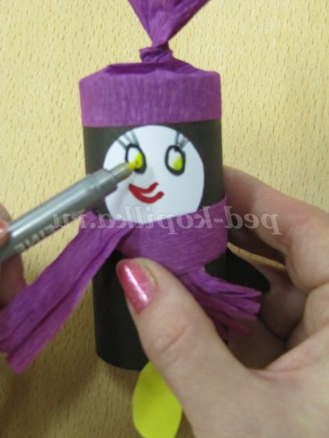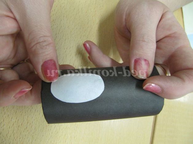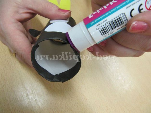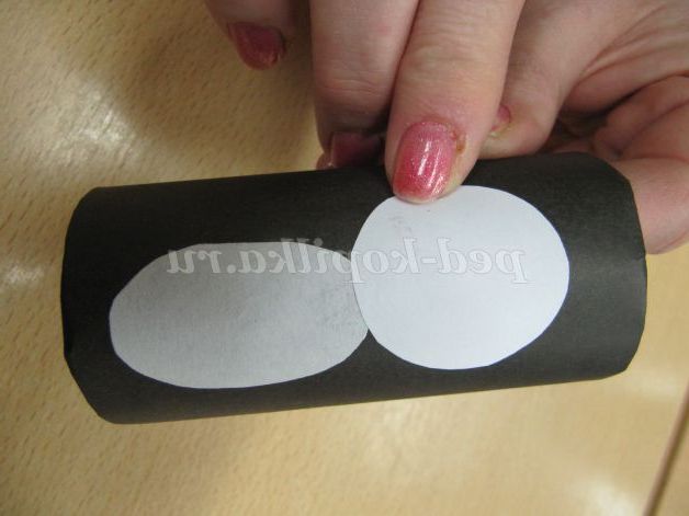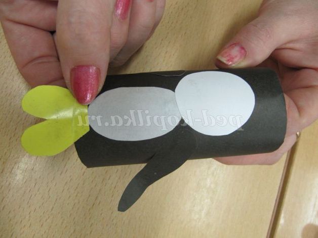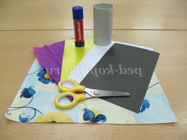 Вам буде потрібно: викидний матеріал (гільза від туалетного паперу), ножиці, кольоровий папір (чорна, жовта, біла, креповая), склеювальний олівець, фломастери.