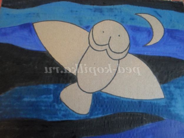 Приклеїти зірочки (макарони), викласти місяць горохом, намалювати гуашшю очі.