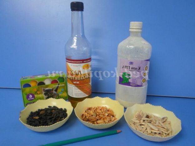 3. Насіння, горох, рис, гречка, кісточки (все, що є), гуаш, олівець.