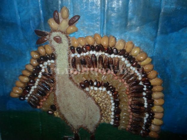 Нанести клей на крила і викласти їх за своїм бажанням. Ми використовували білі та чорні насіння, горох, зелена кава, макарони.