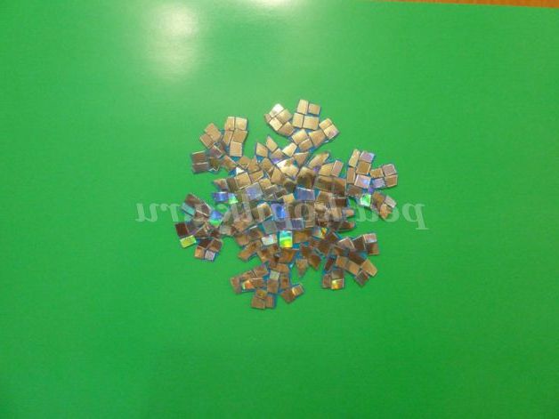 2.Нарежем полотно CD диска довільно на невеликі квадратики, трикутники, прямокутники. Заготівля нагадує «дзеркальну мозаїку».