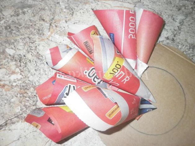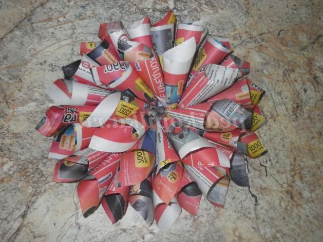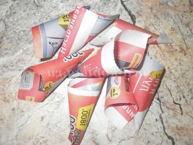 1. З газети нарізати прямокутників 7,5 x 9,5 см. З кожної заготовки згорнути і склеїти кульочки.
