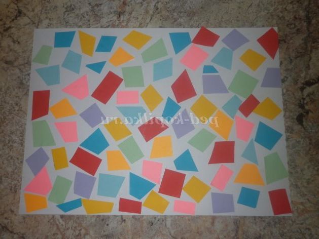 2. Потім, як кажуть мої дівчата, робимо тюнінг листа. Приклеюємо на альбомний аркуш довільно кольорові чотирикутники і трикутники