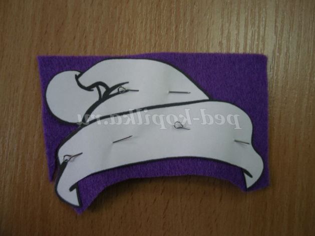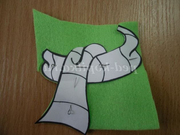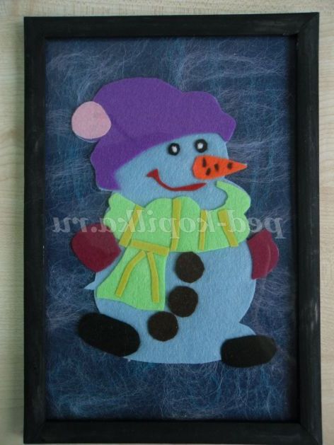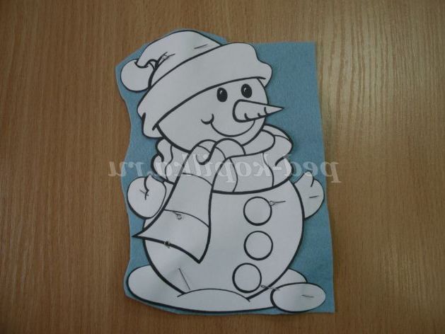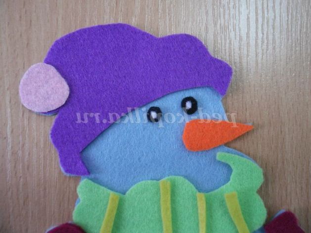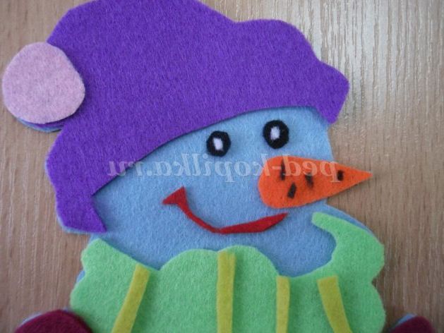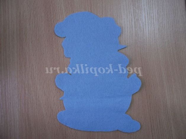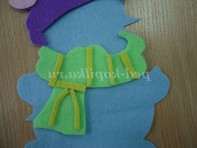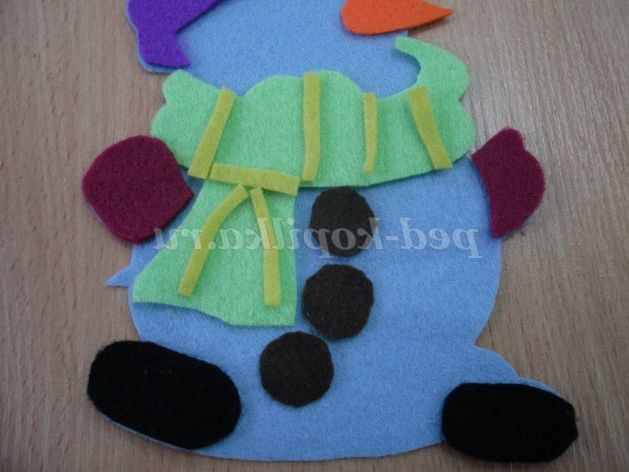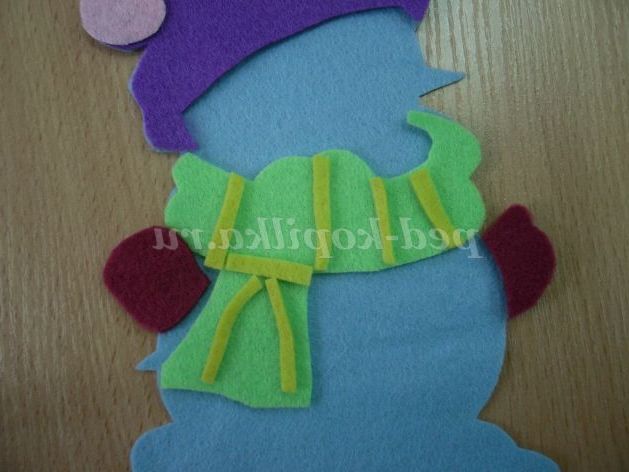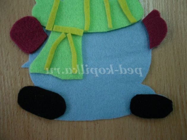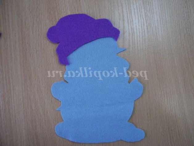 Прикладаємо частини сніговика до листів фетру і вирізаємо їх по контуру, після чого поетапно накладаємо на тіло сніговика.