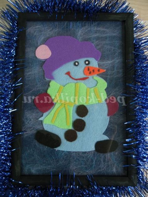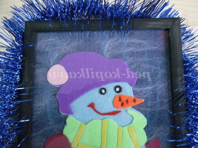 На лист оксамитової папери укладаємо сніговика і притискаємо його склом від фоторамки.