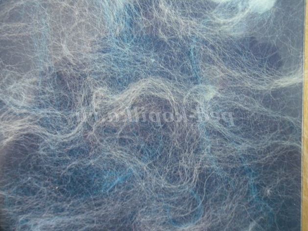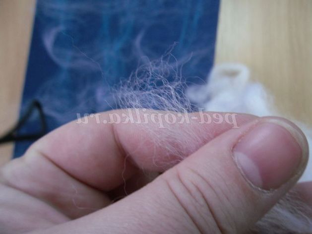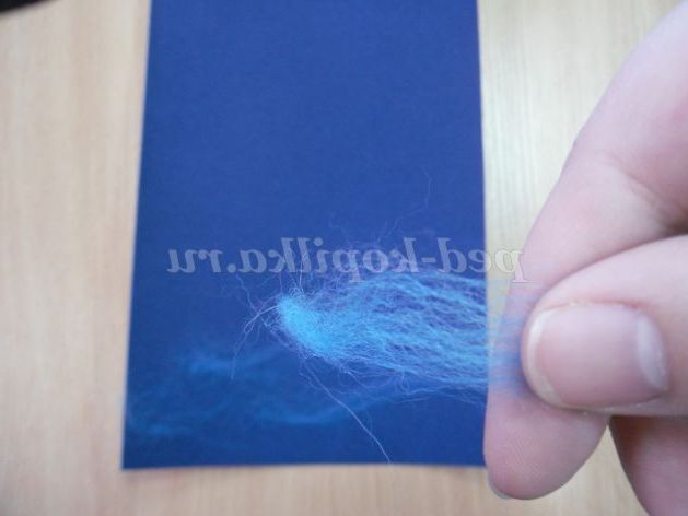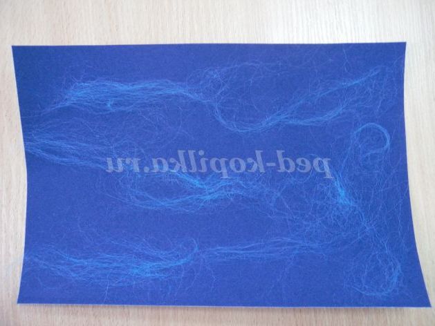 Тепер настав час зробити фон для сніговика. Для цього беремо аркуш оксамитової папери і поступово починаємо укладати на нього тонкі смужки різнокольорової вовни.