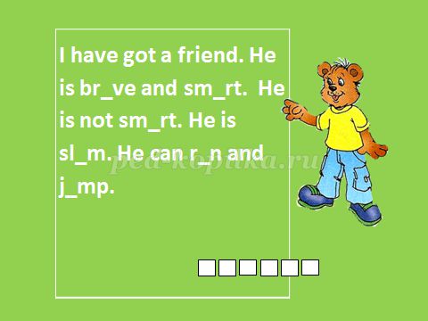 Now let"s do an exercise. Заповніть пропуски в словах, а в порожніх клітинах запишіть, хто друг Біллі, про кого розповідав у відеосюжеті.