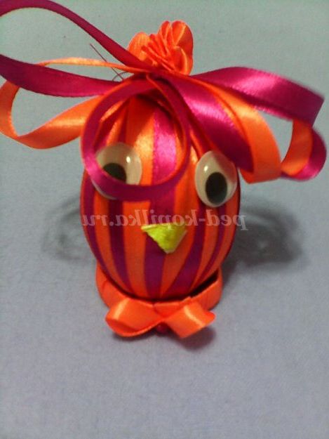 Вся принадність цієї поробки в тому, що собівартість її - сущі копійки. Яйце, вынутое з шкаралупи, ви можете використовувати у випічку - воно не пропаде, стрічок вам буде потрібно близько 2 метрів, що за ціною вийде не більше 5 рублів. Зате виглядає такий...