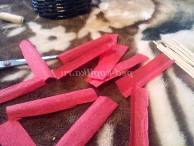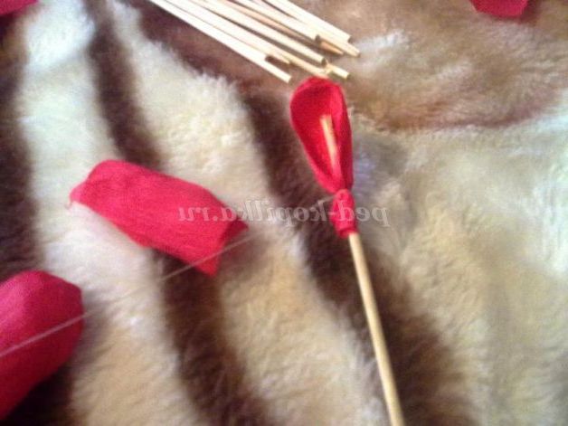 7.Из зеленої гофрованого паперу нарізаємо тонкі смужки, на край смужки приклеюємо двосторонній скотч, і обмотуємо основу і стебло - шпажку.