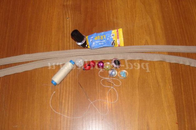 Матеріали: Нитки, голка, блискавка - замок, супер-клей - гель або клейовий пістолет, декоративна шпилька, прикраси (намистини стеклярус, паєтки, пір'я...).