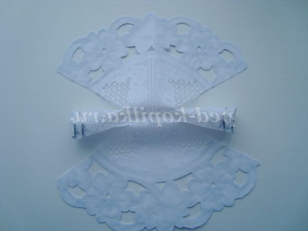 Тепер виготовляємо сукню. Складіть серветку навпіл, з боків виріжте рукави, обрізавши ажурний край. Можна зробити плаття з паперу, спосіб, яким роблять сніжинки, прикрасити край сукні.