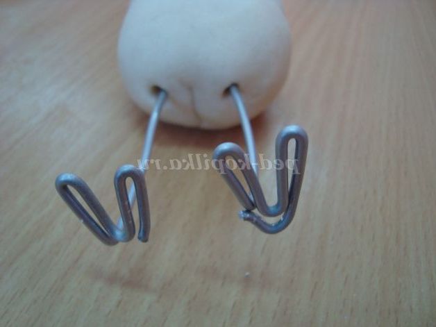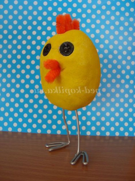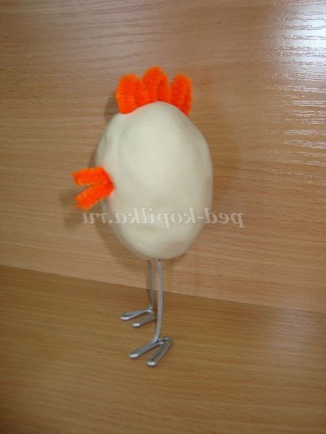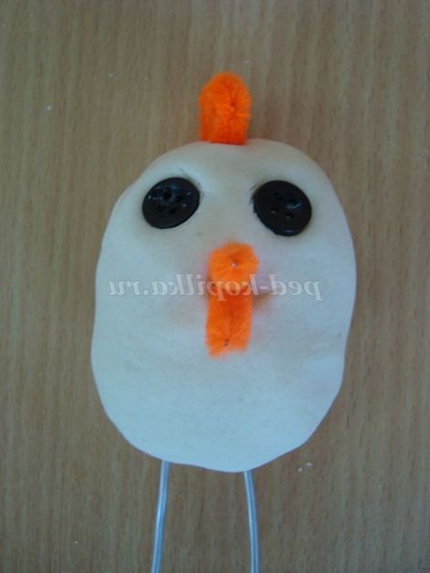 З дроту з ворсом, робимо дзьоб і гребінець, встромляємо в тісто. Гребінець можна зробити з пір'їнок, а дзьоб з картону.