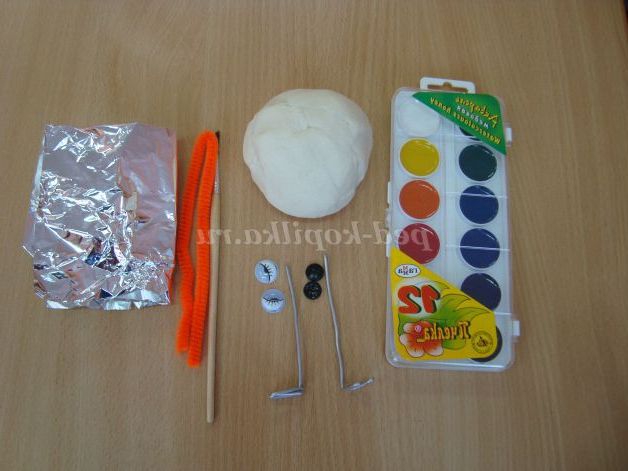 Матеріал: солоне тісто, фольга (від шоколадок), фарби, пензель, ніжки з дроту, гудзики, оченята, дріт з ворсом, дошка для ліплення.