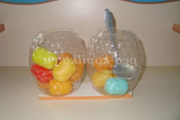 Для виготовлення знадобиться: дерев'яна підставка, 2 пластикові пляшки (у яких нижня частина кругла), ложка яйця від кіндер-сюрпризу.