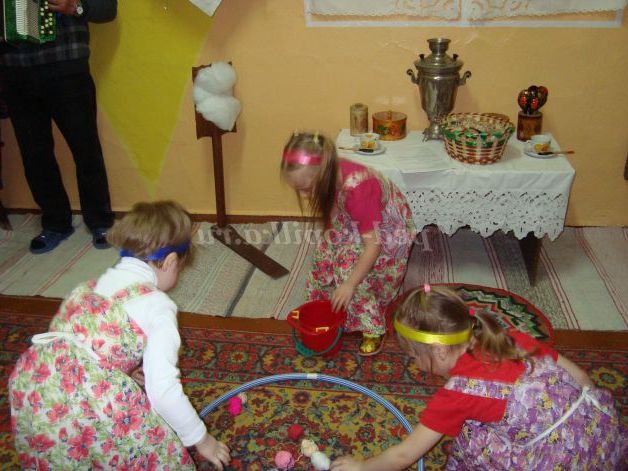 Попередня робота: Знайомство дітей зі старовинної начинням. Розучування прислів'їв, приказок. Відгадування загадок.чтение російських народних казок, розглядання ілюстрацій до них. Проведення російських народних ігор, хороводів.