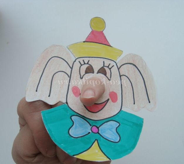 Розфарбувати. Якщо в отвір просунути палець виходить хобот. При русі пальця картинка оживає і викликає сміх (навіть у дорослих, я реготала).
