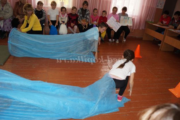 6. Проводиться гра "Перетягування канату". Учасники команд шикуються в дві колони так, щоб між ними знаходилася контрольна лінія. Суперники беруться за канату, середина якої знаходиться рівно над лінією (середину можна відзначити тонкою смужкою з клейкого паперу). За сигналом судді учасники намагаються перетягнути суперників на свою сторону. Переможця визначає журі.