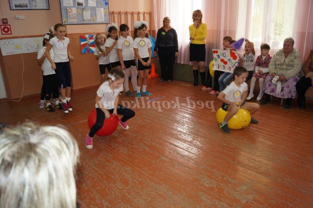 5. Стрибки на гімнастичних м'ячах. По одному всі учасники команд стрибають на м'ячі до орієнтиру і назад. Капітан піднімає руку.