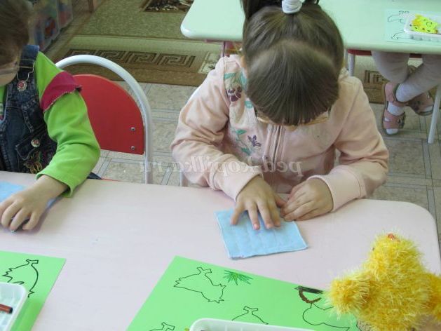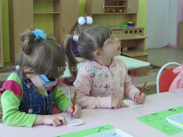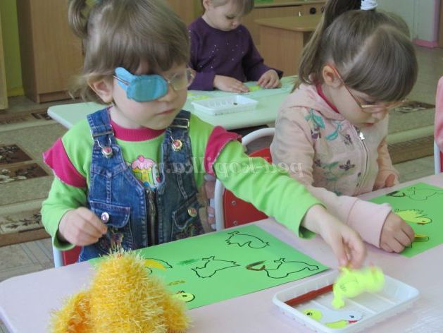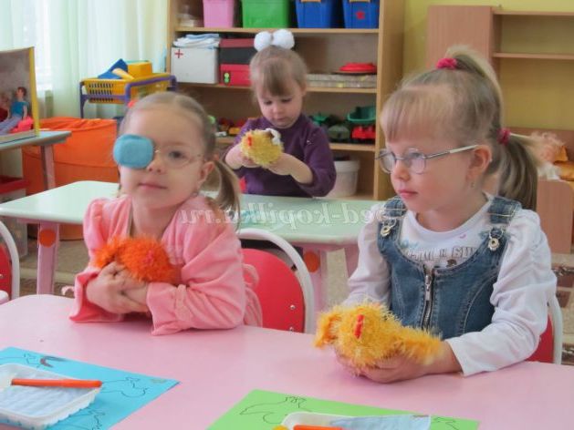 Педагог розсаджує дітей з урахуванням оклюзії і роздає допомоги згідно з зоровим навантаженням. Коли всі діти впораються із завданням, вчитель-дефектолог пропонує дітям закрити очі і, прибравши паперові яйця, ставить перед кожним м'яку іграшку курчати.