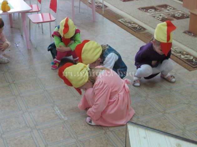 Педагог - а тепер я вас всіх перетворила у курчат (одягає шапочки курчат) ми вийдемо надвір і пограємо в гру «Курчата і сова».