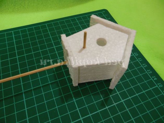 З шпажки відрізаємо жердинку довжиною 6 див. Вставляємо жердинку і жердину, на якому і буде триматися наш шпаківня.