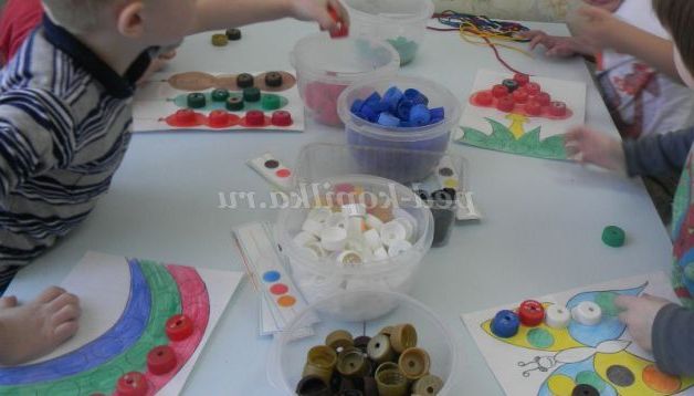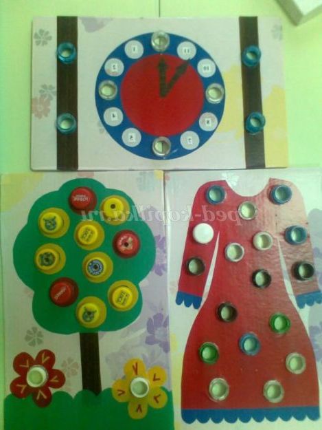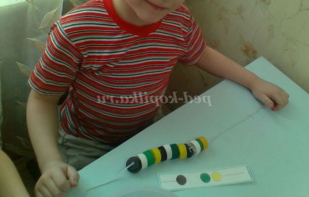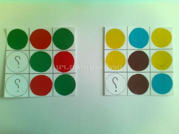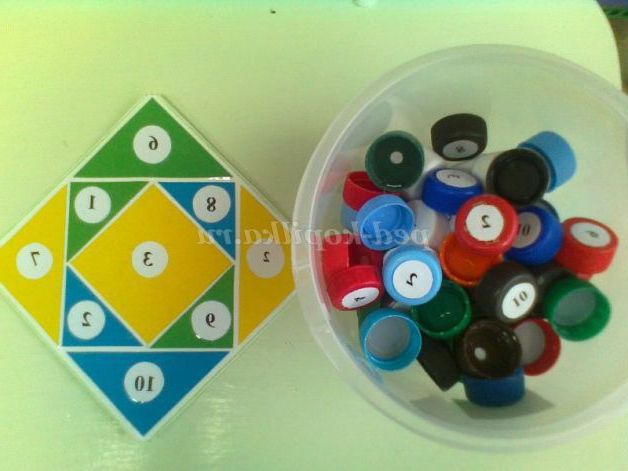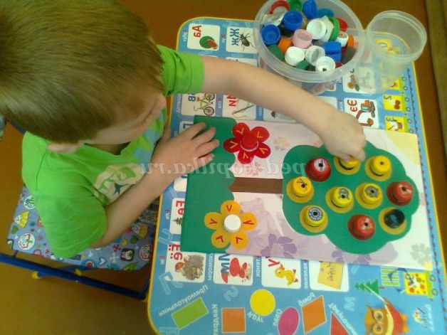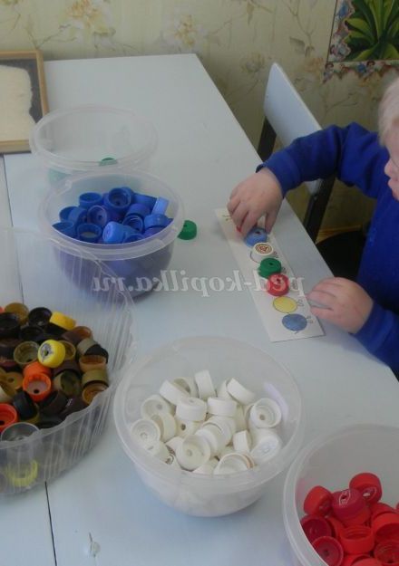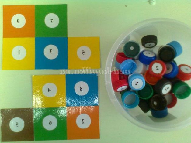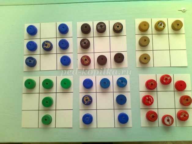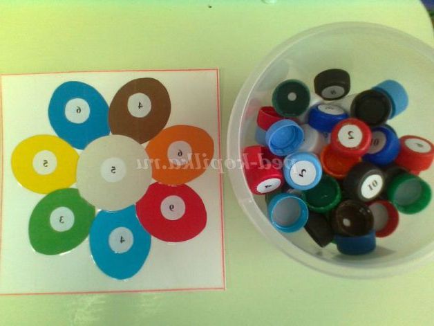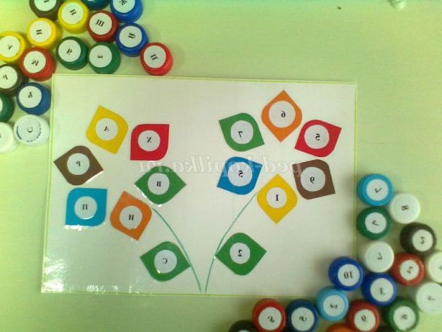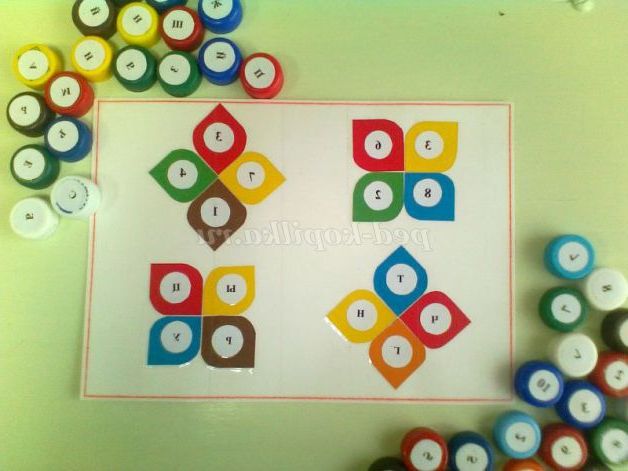 Підготовка гри: наклеїти цифри і букви на різного кольору кришки, яких потрібно дуже багато, і підготувати схеми. Зміст: викласти кришку потрібного кольору з цифрою на схему. Ця гра добре розвиває увагу, цветовосприятие.