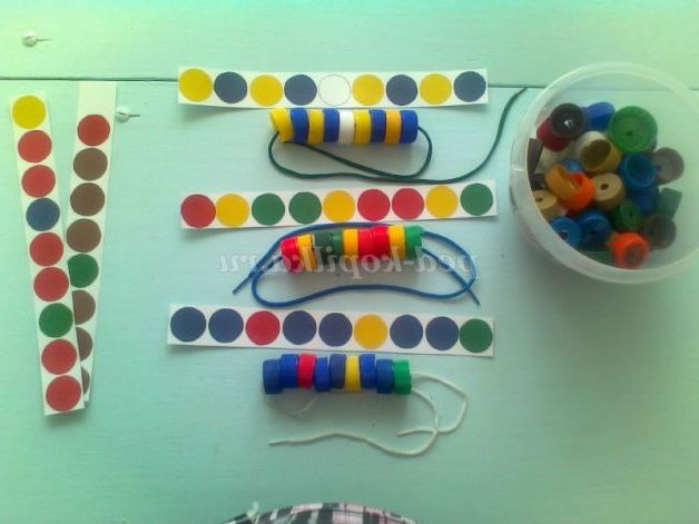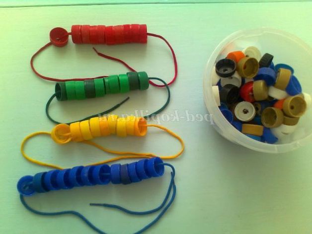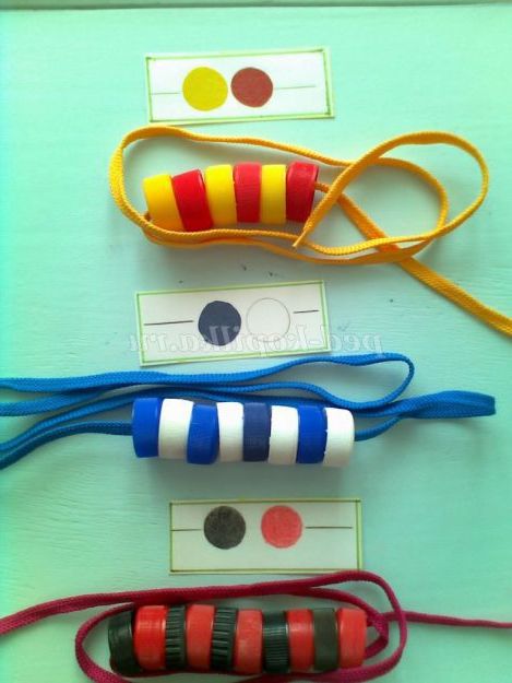 1. Нанизуємо кришечки за принципом збігу кольору кришки і шнурка: білий шнурок - білі кришки, на червоний шнурок - червоні кришки і т.д.