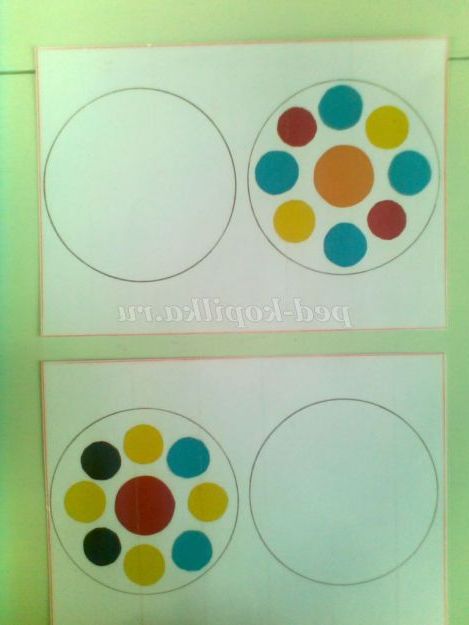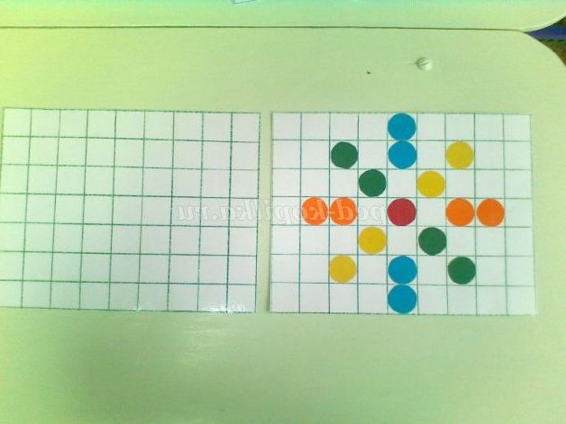 1. Звернути увагу дітей на розташування кольору на плані-схемі. Вчити описувати розташування кришок різного кольору на зразку і виконувати завдання по пам'яті (прибравши схему).