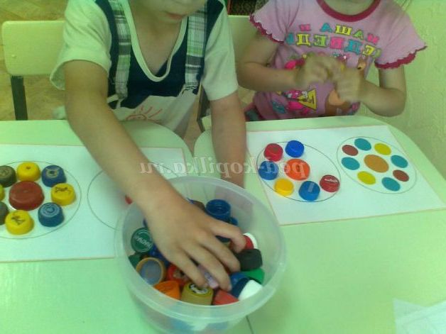 Дітям пропонується картинка з гуртками, розфарбованими в певний колір. Завдання: розставити кришечки у відповідності з кольором.