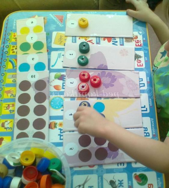 Дитині пропонуються картки з цифрами і різнокольоровими гуртками. Завдання подивитися на цифру, назвати її, потім викласти стільки кришок, скільки показує число.
