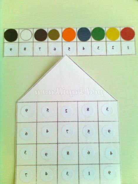 1. Дітям пропонується схема з різнокольоровими колами і цифрами під ними, окремий бланк у вигляді будиночка з віконцями, на які наклеєні цифри. Завдання: запалити у вікнах світло (розставити кришки у вікнах за схемою).