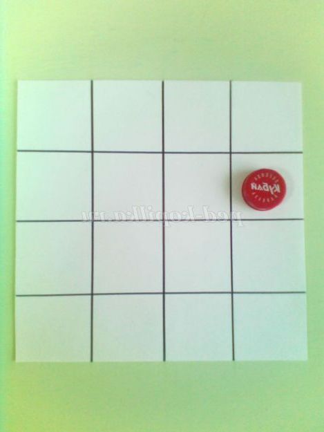 Або як варіант: за принципом графічного диктанту, пересувати кришку по клітинам від заданої клітини: 1 клітинка вниз, 2 праворуч, 1 вгору і т.д. (у бланку клітин може бути більше)