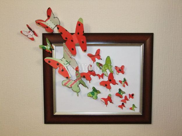 Тепер починаємо звичайним паперовим приклеювати клеєм наших метеликів до полотна. У нижньому лівому куті оселяться найменші, і по мірі просування їх правому верхньому куті, розмір метеликів збільшується. Не бійтеся виходити за рамку! Посадіть кілька штук і на саму рамку. І після того, як ми визначилися з місцем на стіні, "Посадимо" парочку і на стіну. Ефект виходить дуже цікавий, об'ємний.