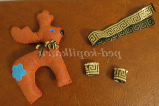 4. Наш оленя готовий, залишилося його задекорувати, для цього ми використовуємо: латку, намистинки для очей і носа, тасьму для бантика і копитця.