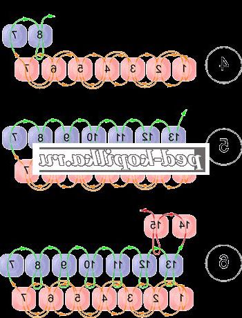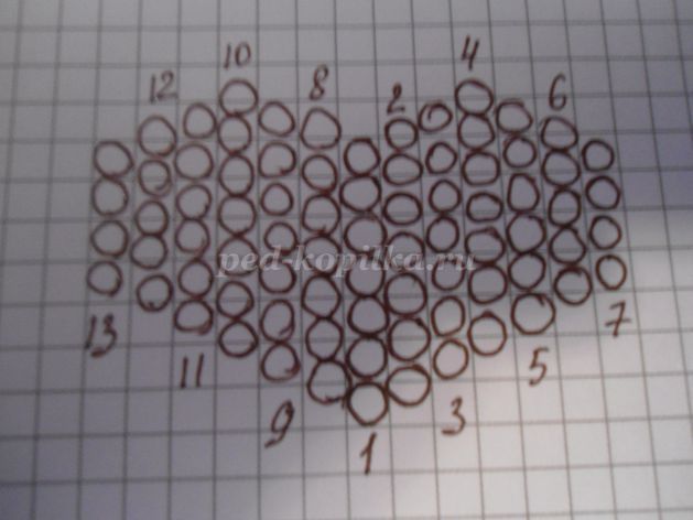 Починаємо плести з середини за схемою. Цифри вказують початок ряду.