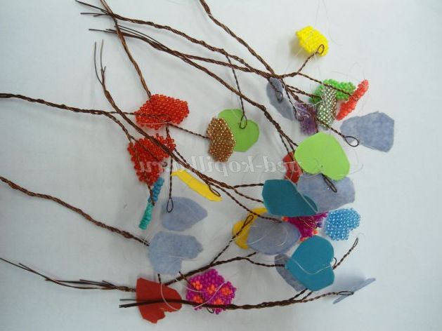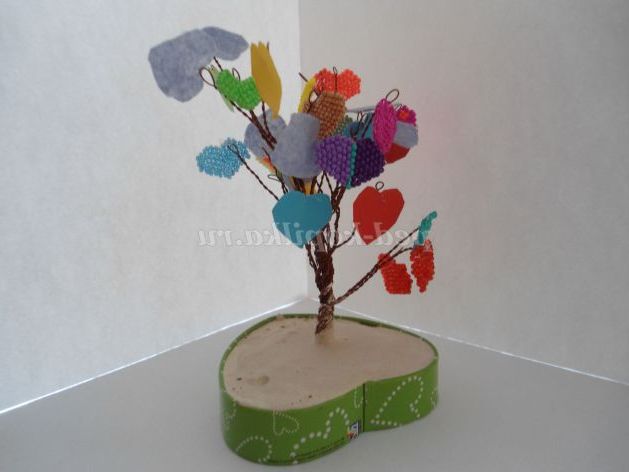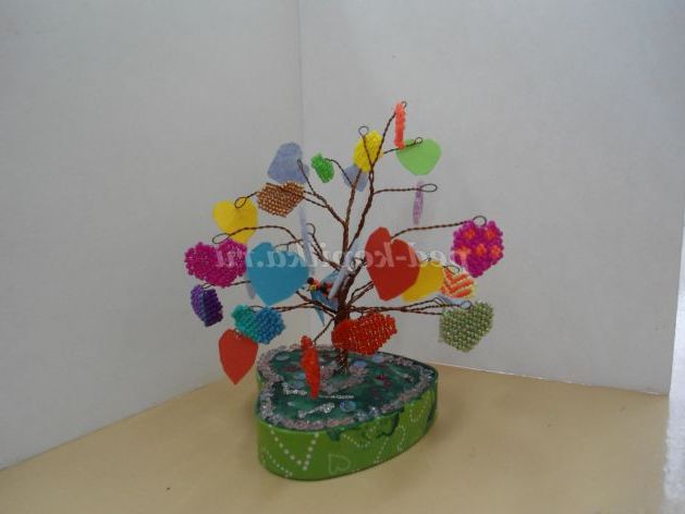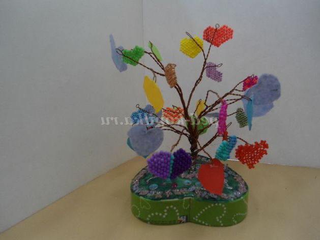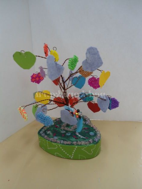 Найчастіше 14 лютого в День святого Валентина дарують один одному " Валентинки " - сувеніри у формі сердечок. Сердечко-Валентинку можна відправити по пошті, смс, а також підкинути таємно. Валентинка - це маленька листівка. Зазвичай у неї вписують вірш про кохання або просто визнання в любові. Багато люблять своїм половинкам у День святого Валентина (День всіх закоханих) дарувати м'які іграшки, цукерки, квіти, томики віршів про кохання, повітряні кульки у формі сердечок. Чому б і ні? А ми вирішили подарувати ціле дерево сердець. Нам не вистачило часу і трохи терпіння, тому сплели тільки 14 сердечок з бісеру, решта 16 зробили з фетру та кольорового картону.