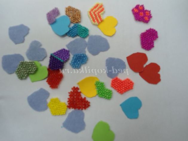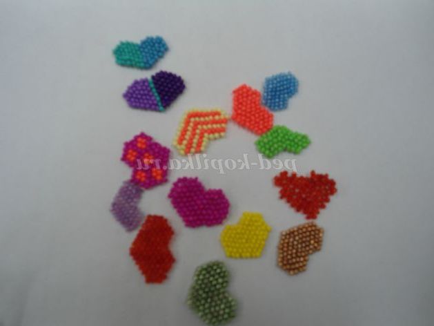 Сердечка з бісеру плетуть плетінням цегельний стібок. Це плетіння нагадує "цегельну кладку".