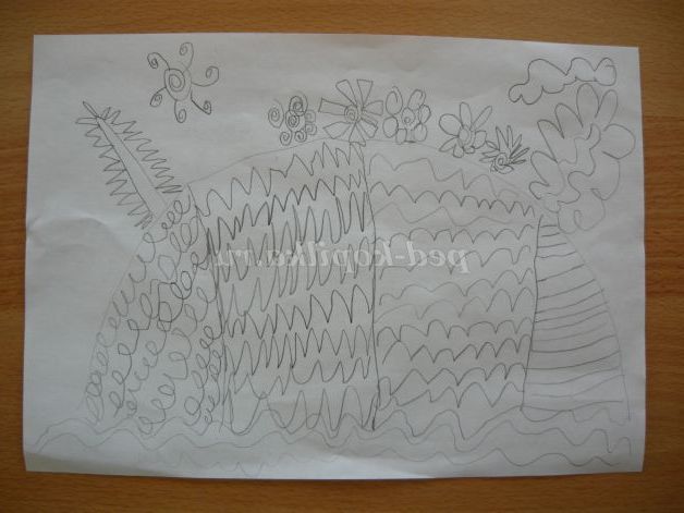 Завдання: Вчити дітей виконувати малюнок, використовуючи різні лінії. Допомогти запам'ятати їх назва (пряма, ламана, хвиляста, "завитки", "петельки", горбки"). В ігровій формі тренувати дітей у малюванні простим олівцем. Розвивати фантазію, окомір, почуття ритму і композиції, дрібну моторику і координацію рухів руки. Виховувати самостійність, акуратність і дбайливе ставлення до своїх малюнків.