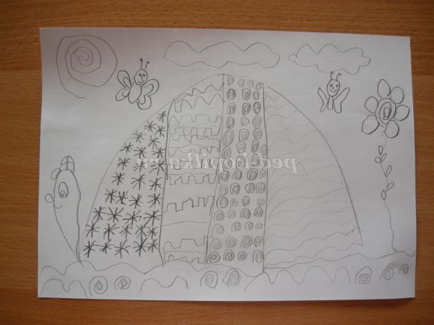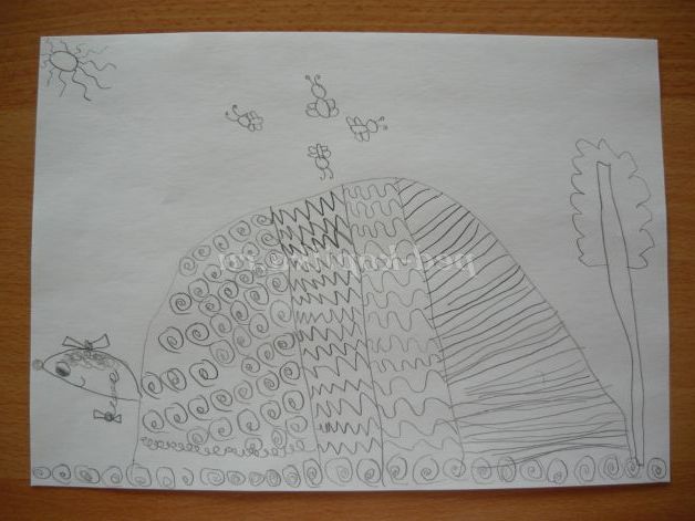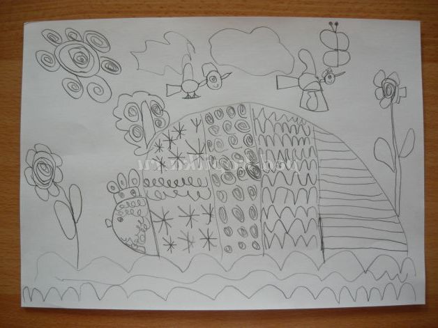 "Черепашка гуляє" Ще один варіант рисунка простим олівцем з використання різних ліній.