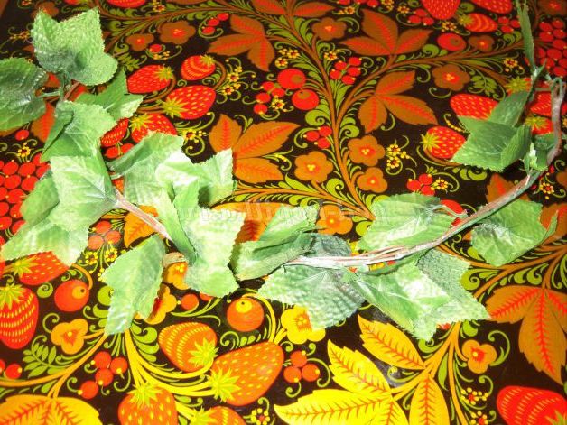Необхідні матеріали: штучні квіти різних відтінків і розмірів (біля 10 штук), сірники, ножиці, скотч, нитки, голка, штучна ліана з виноградними або будь-якими іншими листям, довжиною в 2 окружності голови дитини.