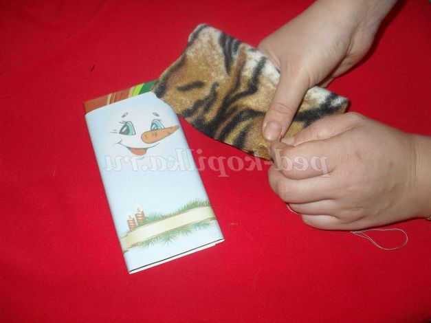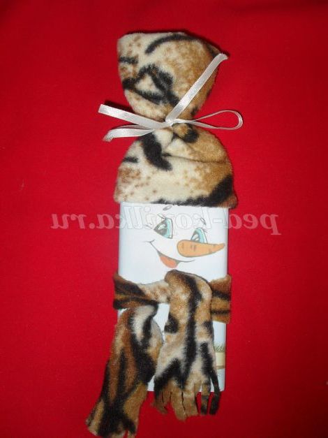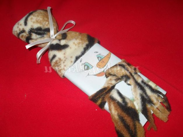 Шоколад,шаблон з паперу Сніговик,нитки з голкою,щільний матеріал,клей,ножиці,атласна стрічка