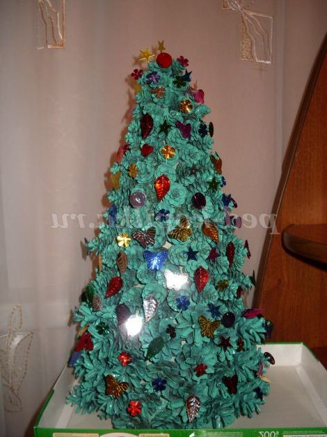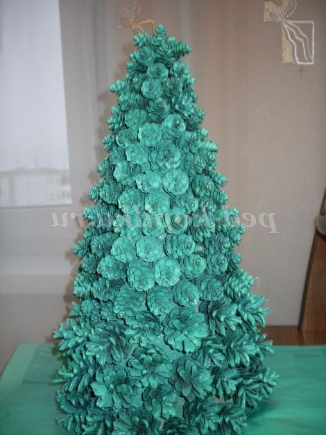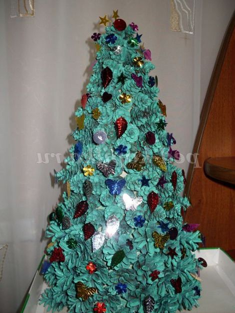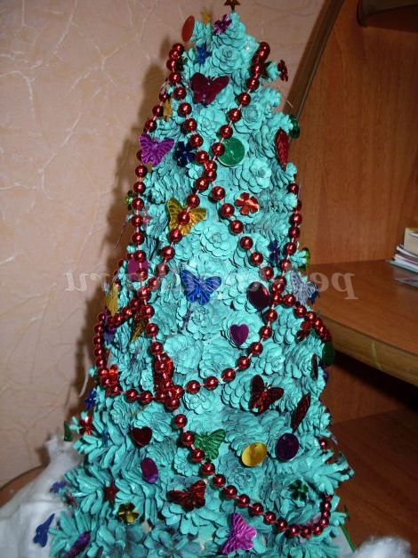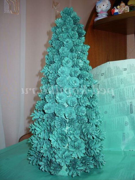 Після того, як всі шишки будуть приклеєні, візьміть балончик з фарбою і розпиліть по всій поверхні ялинки в 2 шари з інтервалом 10 - 15 хвилин.