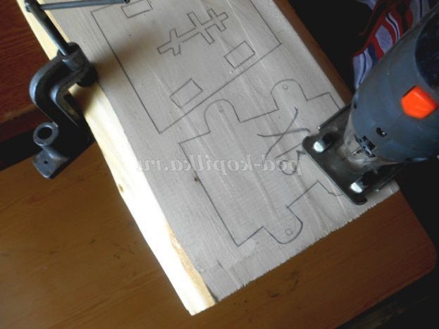 Лобзиком вирізаємо по контуру. При роботі з лобзиком треба дотримуватися деяких правил техніки безпеки: 1) Надійно закріпити заготовку до робочого столу. 2) Пиляння проводити плавно, не застосовуючи зайвих зусиль на лобзик.