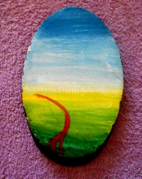 Для неба використовуємо блакитний колір, який наносимо зверху вниз, поступово додаючи білу гуаш. На середині зрізу у нас виходить лінія горизонту (повітряна перспектива).