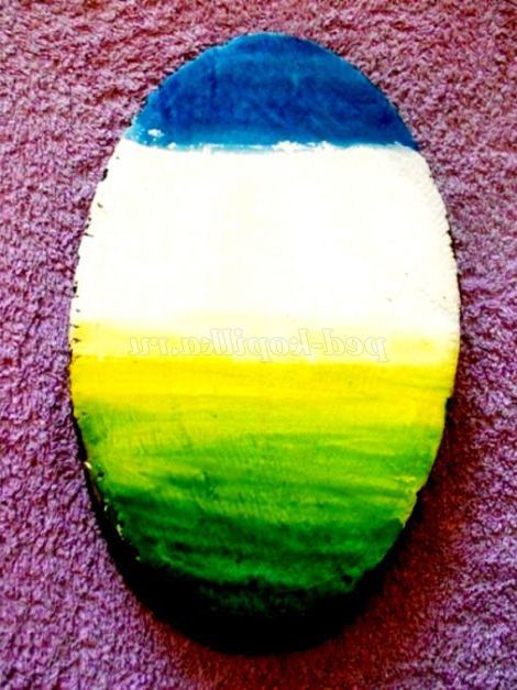 Роботу починаємо з нанесення темно - зеленої (смарагдовою) гуаші знизу вгору, поступово додаючи трав'янисто - зелену і жовту гуаш до середини зрізу.
