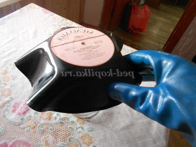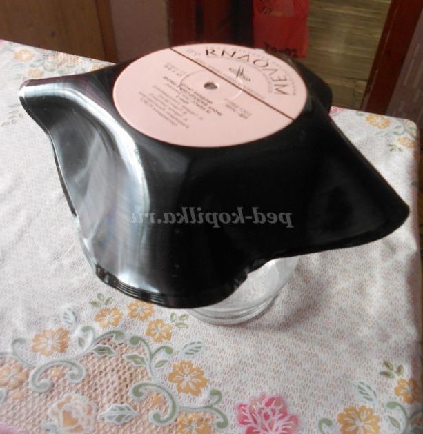 14. Надаємо м'якою платівці потрібну нам форму. Для зручної роботи під платівку можна що-небудь підкласти. Сьогодні нам під руку попалася скляна банка. Те, що треба!