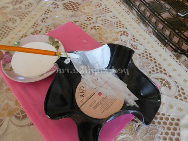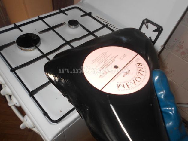 11.Переходим до другої частини нашої роботи - виготовлення тарілки. Я думаю, в будь-шкільній бібліотеці, у багатьох кабінетах ще збереглися і лежать "мертвим" вантажем колись улюблені нашому серцю грамплатівки "Мелодія". Вони і потрібні нам сьогодні!