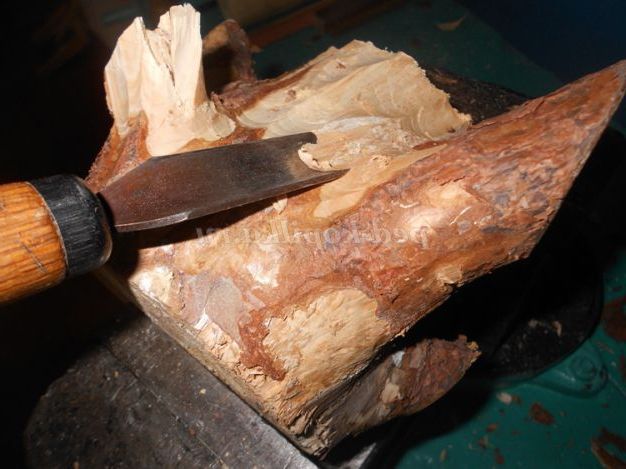 4. Вирізаємо поверхню нашої заготовки напівкруглою стамескою. Стамеска також є небезпечним ріжучим інструментам. Поводитися з ними слід обережно. Не докладати великих зусиль при різанні стамескою. Якщо при роботі необхідно ударяти по ручці стамески, то тримати її треба в лівій руці, а киянку - в правій і, поставивши стамеску на місце вирубки, наносити по ручці стамески легкі удари.