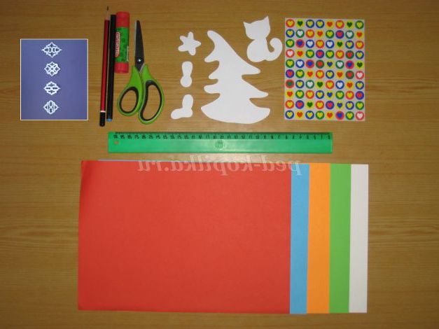 Матеріали: акварельний лист, простий олівець, лінійка, ножиці, клей, олівець, фломастер чорний, кольоровий папір (зелена, помаранчева, блакитна, червона і біла), наклейки, лекала.